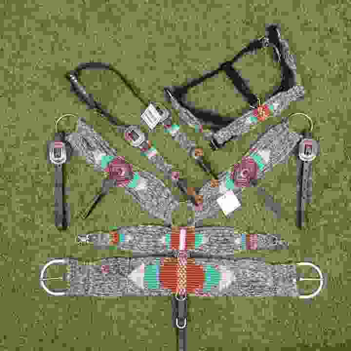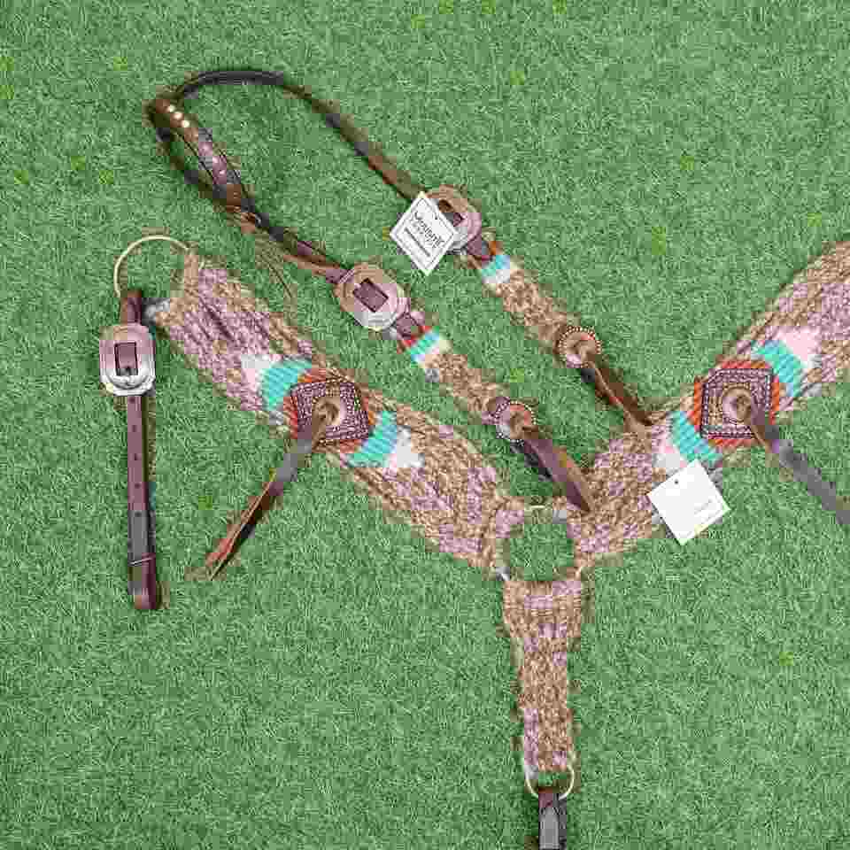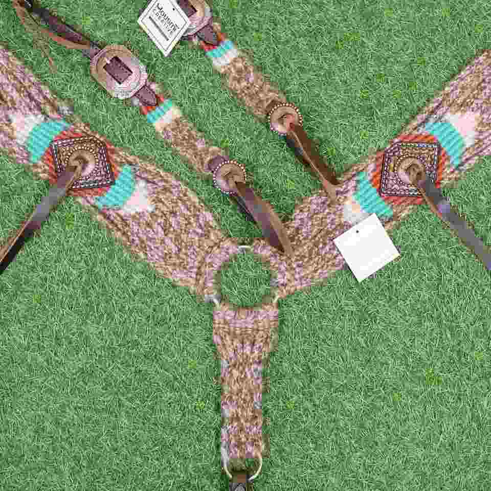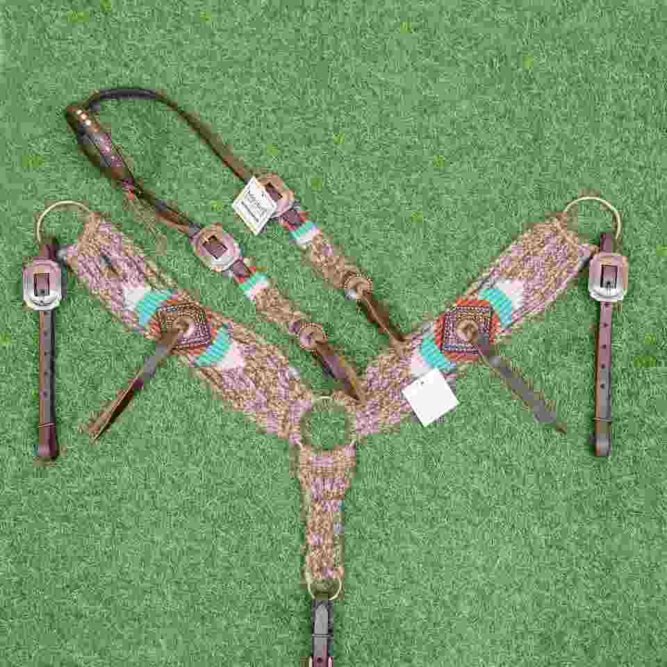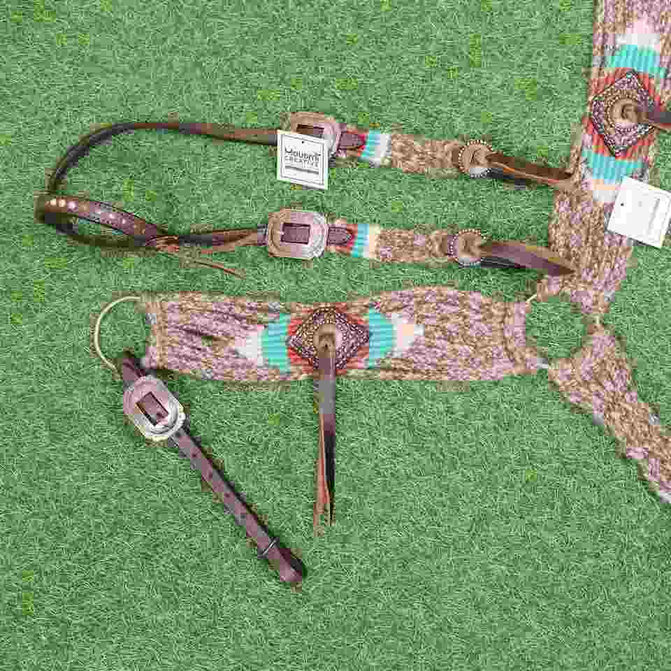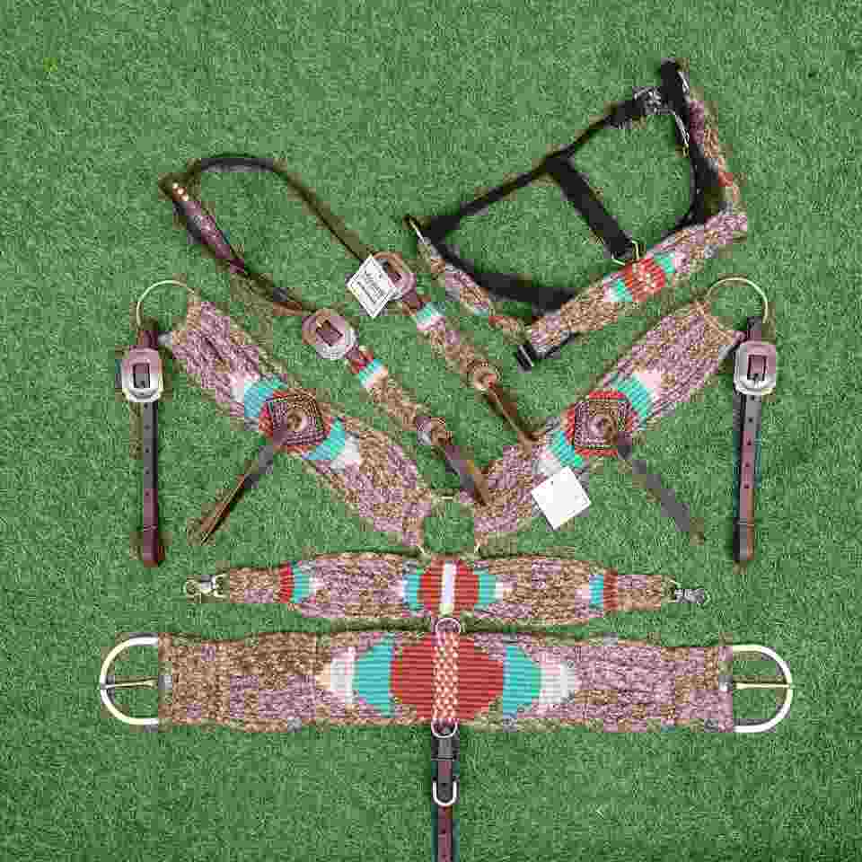 ชุดบังเหียนและสายรัดอกม้าสไตล์ตะวันตก สีเบจเทอร์ควอยซ์น้ำตาลแดง ทำจากขนโมแฮร์ ขนาดรอบอก 32 นิ้ว ปรับแต่งสีได้ ผลิตด้วยมือจากอาร์เจนตินา