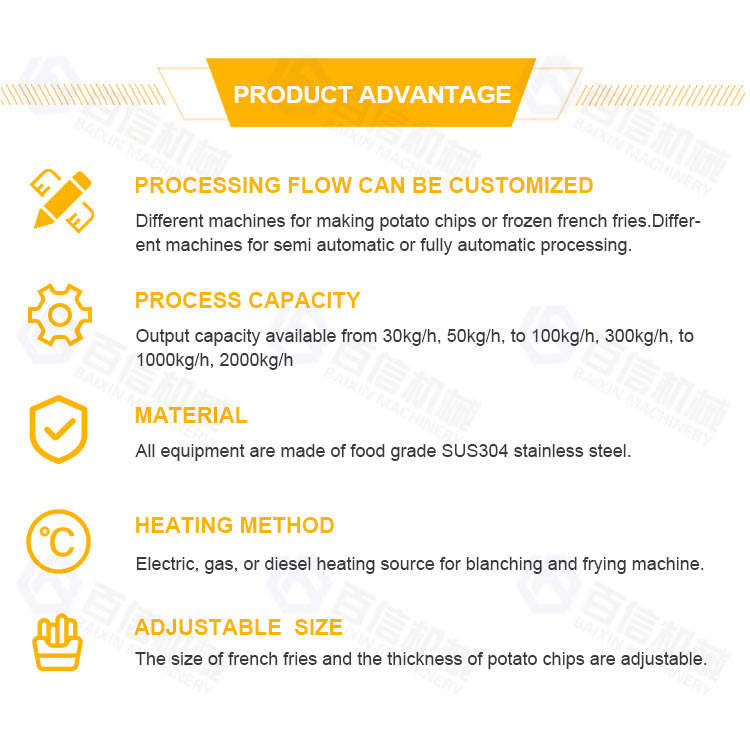 คุณสมบัติ:สายการผลิตมันฝรั่งทอดสามารถปรับแต่งได้