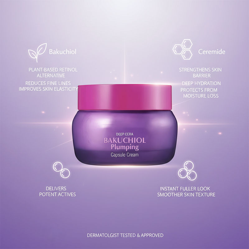 ครีมบำรุงผิวหน้าบาคูชิออล พลัมปิ้ง แคปซูล ผสมไนอะซินาไมด์ และสารประกอบเซราไมด์คอลลาเจน 5 ชนิด สำหรับมอยเจอร์ไรเซอร์เรตินอล