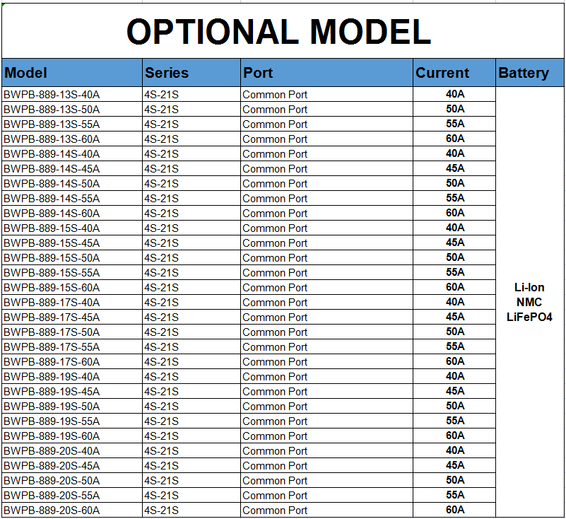 ปล่อย/ชาร์จปัจจุบัน:13S, 17S, 20S, 40A, 45A, 50A, 55A, 60A