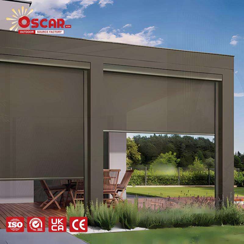 ม่านม้วนระเบียงแบบมีมอเตอร์ สไตล์สเปน ผ้า PVC สำหรับใช้งานกลางแจ้ง