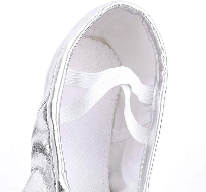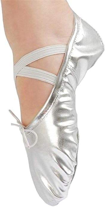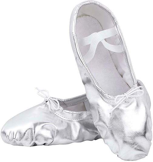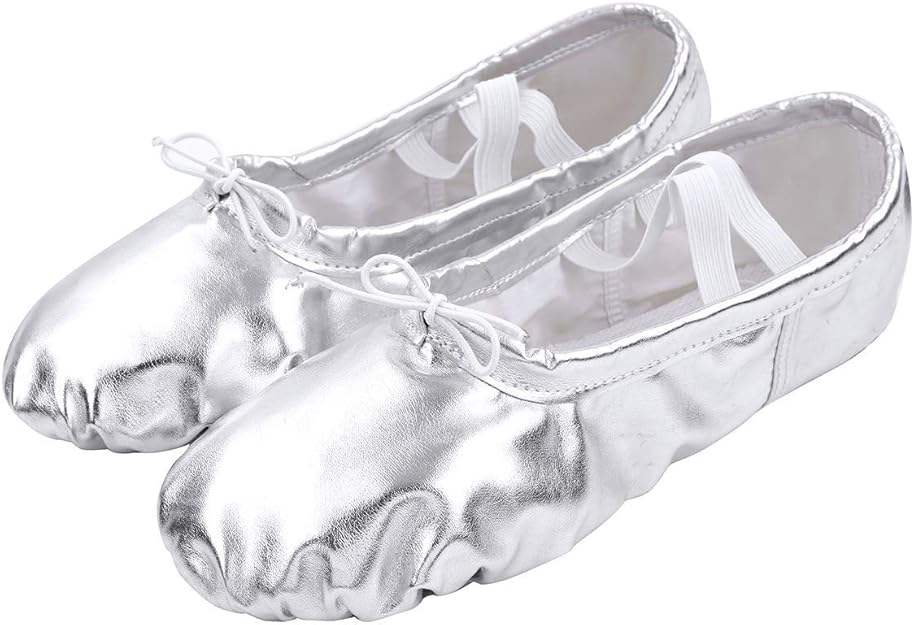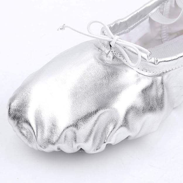 รองเท้าบัลเลต์แบบแยกส่วน พื้นรองเท้าแบน รองเท้าหนังสีเงินสำหรับเด็กหญิง ผู้หญิง