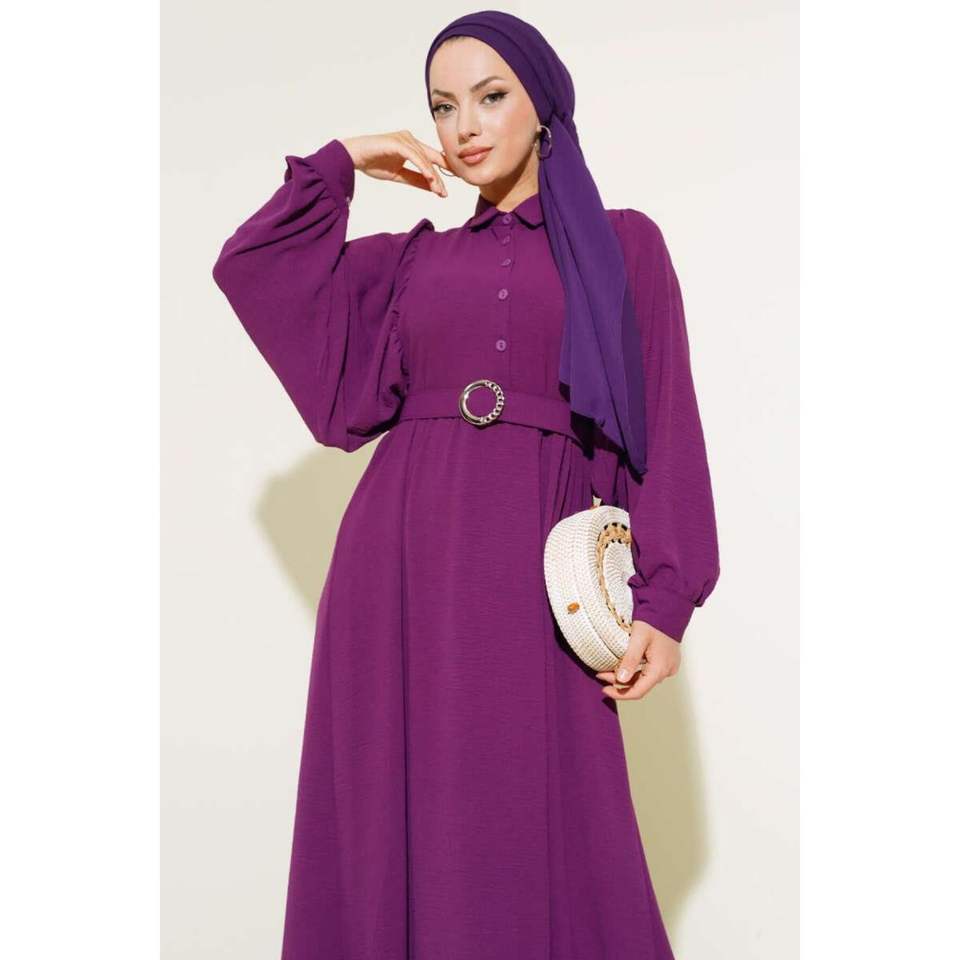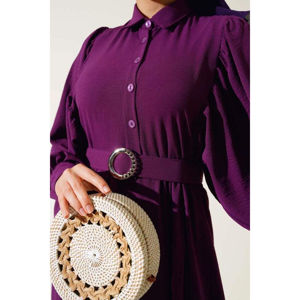 ชุดเดรสเชิ้ตคอปกแขนบอลลูนสีม่วง