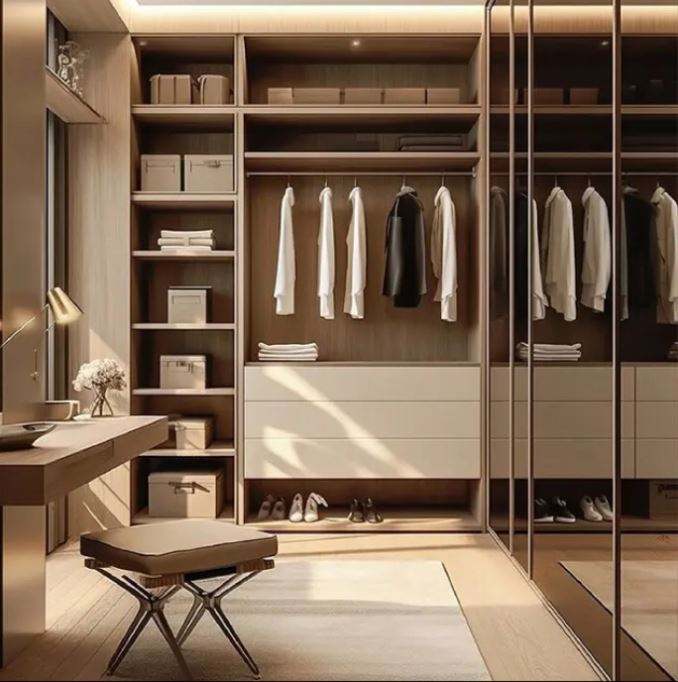 ตู้เสื้อผ้าแบบวอล์คอิน บัลอม 2025 ระบบจัดเก็บแบบโมเดิร์น ตู้ไม้โอ๊คบานเลื่อนกระจก วัสดุ MDF ตู้เสื้อผ้าไม้จริง