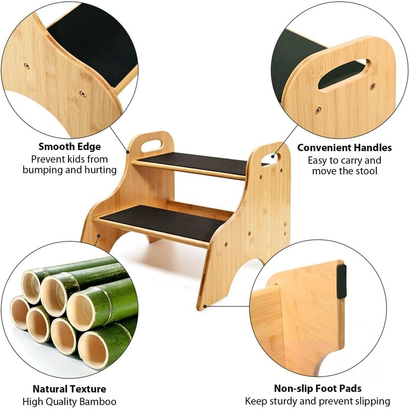 Bamboo 2 Step Stool, Sturdy Kids Step Stool with Non-Slip Stepping Surface, 2 Tier Stepping Stool