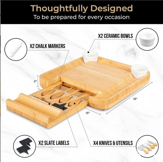 เขียงไม้ไผ่พร้อมชุดมีดลิ้นชักซ่อนเขียงไม้ไผ่และถาดชาร์คิวรีพร้อมอุปกรณ์