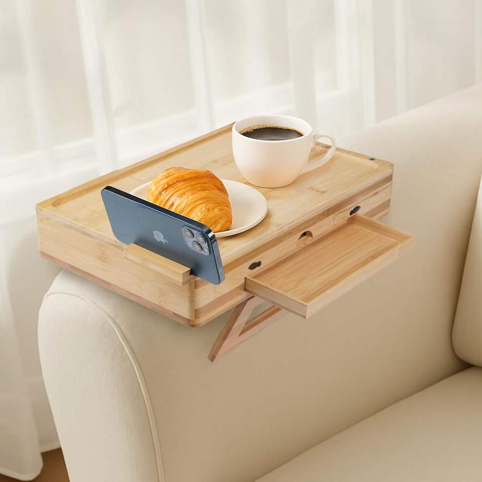 โต๊ะวางแขนโซฟาไม้ไผ่พร้อมลิ้นชัก ถาดวางแขนโซฟาไม้ไผ่พร้อมที่วางโทรศัพท์ โต๊ะหนีบพับได้สำหรับวางของว่างและเครื่องดื่ม