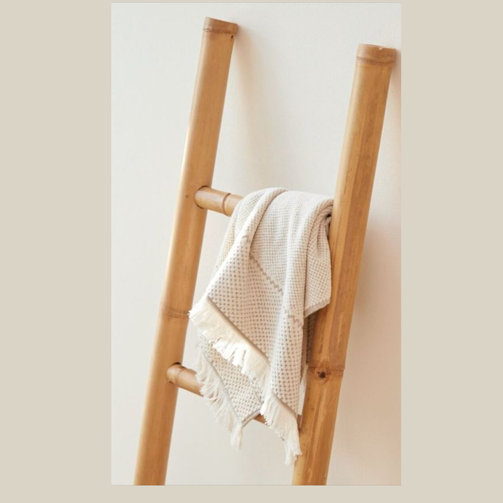 บันไดในร่มกลางแจ้งทำจากไม้ไผ่พร้อมตะกร้าแขวนของตกแต่งกลางแจ้ง