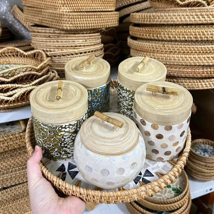 Bamboo Jar Storage Box with Mother of Pearl Eggshell Inlay Round & Cylinder Shape Jar For Species Tea Made in Vietnam Home Decor