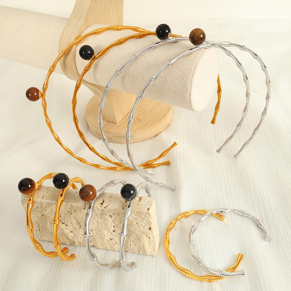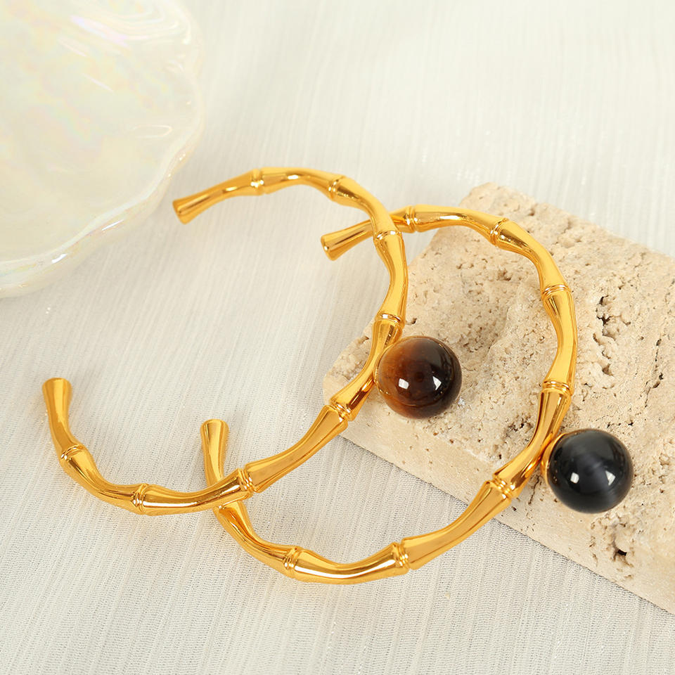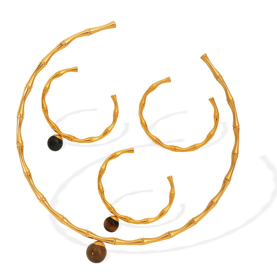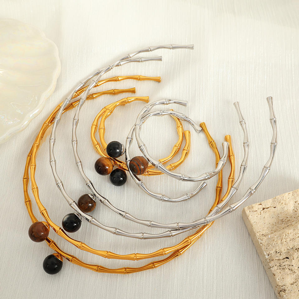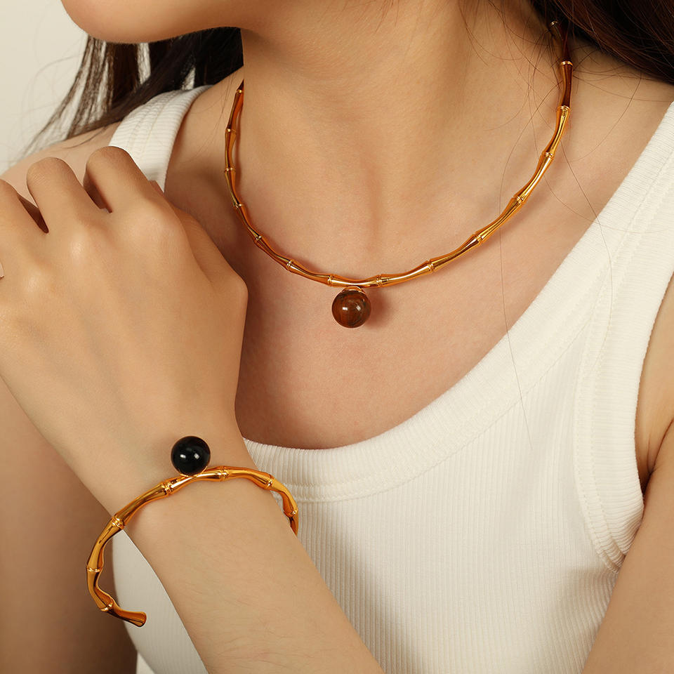 สร้อยคอแฟชั่นผู้หญิงแบบเปิดลายข้อต่อไม้ไผ่ สแตนเลสสตีล ชุดสีทอง สีเงิน ประดับด้วยหินธรรมชาติ เหมาะสำหรับงานปาร์ตี้