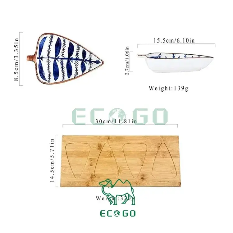 จานไม้ไผ่เสิร์ฟพร้อมชามรูปใบไม้ชุดจานเซรามิกใส่อาหารเรียกน้ำย่อยผลไม้ลูกกวาดถั่วชีส