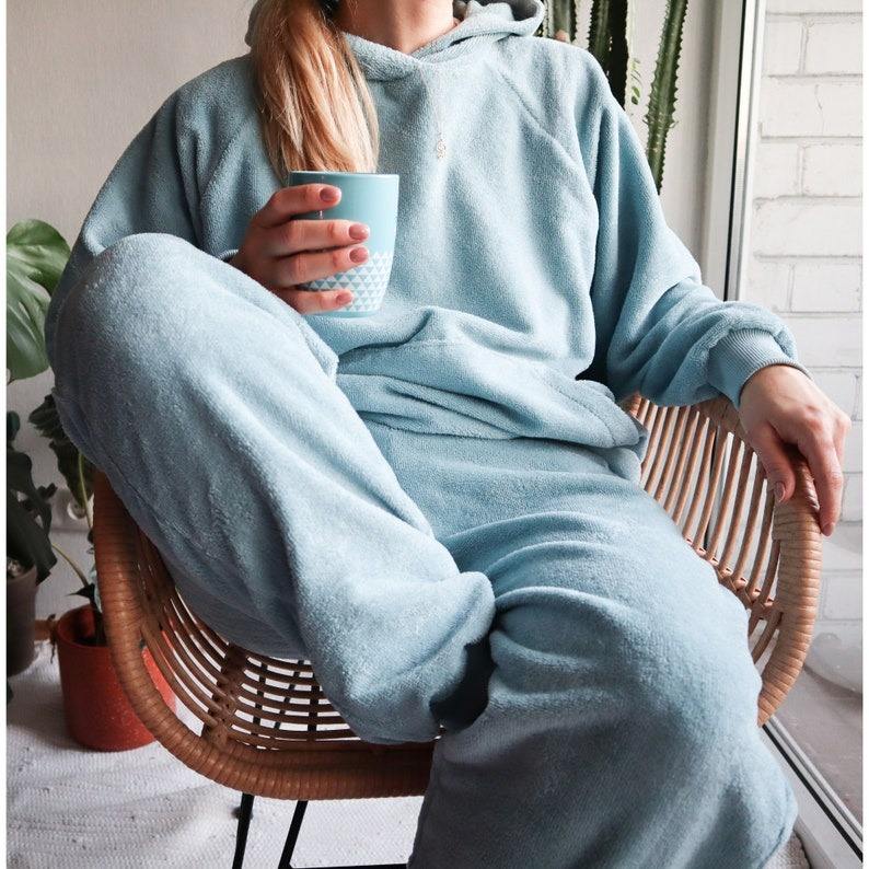 ชุดเสื้อผ้าใส่อยู่บ้านทำจากผ้าฝ้ายไม้ไผ่ใส่สบายเสื้อสเวตเตอร์ขนฟูและกางเกงวิ่งสไตล์หน้าเรียบสำหรับฤดูร้อน