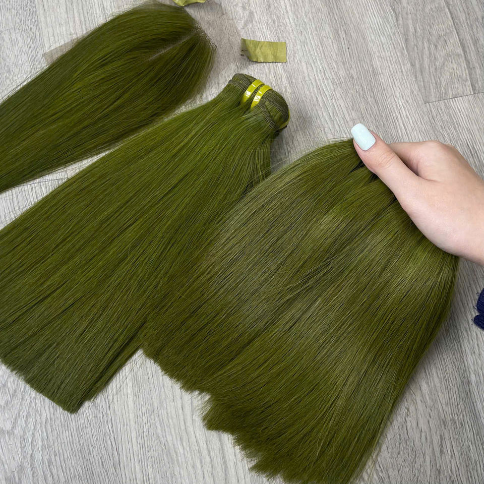 ผมแท้เวียดนามคุณภาพสูงแบบ Super Double Drawn สำหรับทำวิกผมแบบมัดรวมสีเขียวกล้วย พร้อม Closure ขายดีมาก