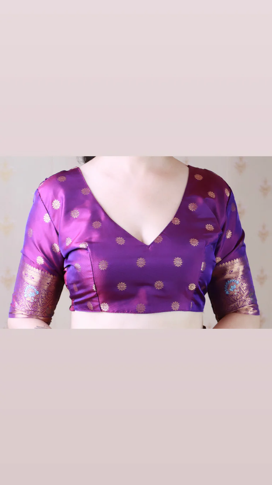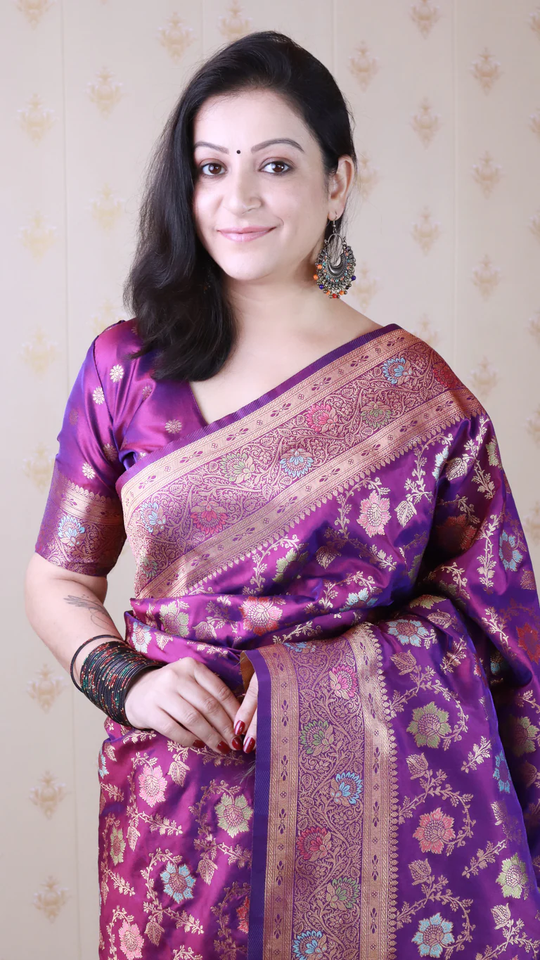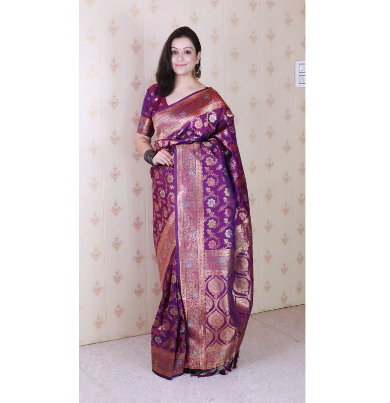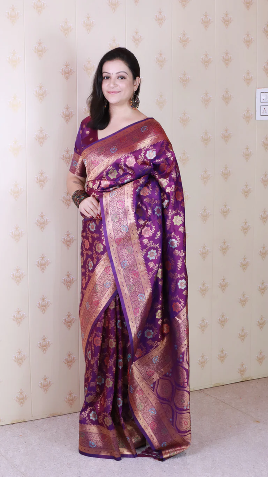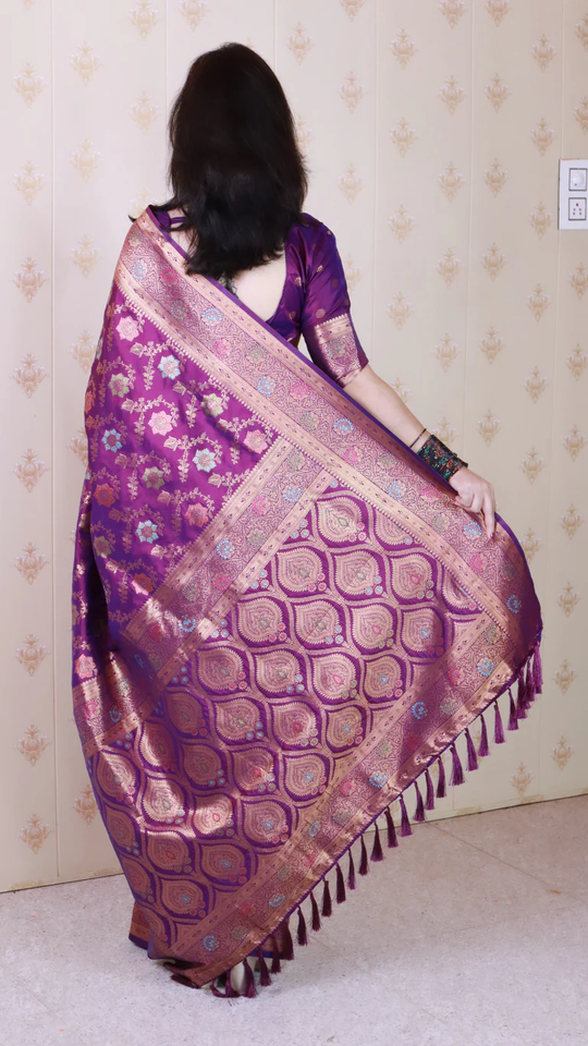 ผ้าไหมบาแนรัส จาล แบบนุ่ม สีม่วงทอง ปักด้วยดิ้นซารีและมีนาคารี สำหรับงานแต่งงาน งานเทศกาล และงานเฉลิมฉลอง ด้วยงานปักดิ้นซารีและมีนาคารีที่สวยงาม