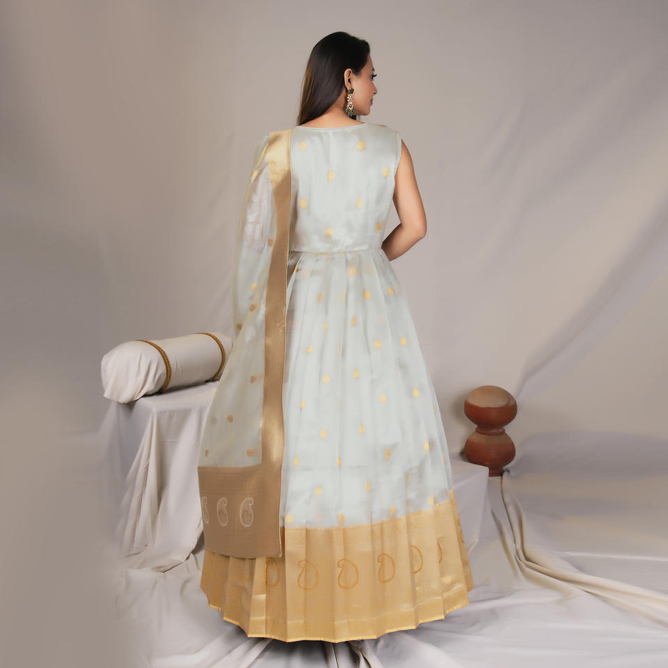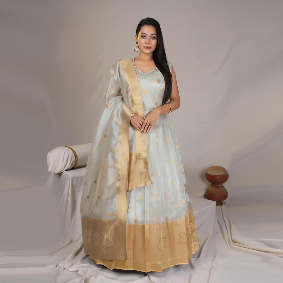 ชุดเดรสยาวผ้าไหมบานาราซี พร้อมงานปักดิ้นทองหรูหรา สำหรับงานเทศกาลและงานเลี้ยง พร้อมผ้าคลุมไหล่