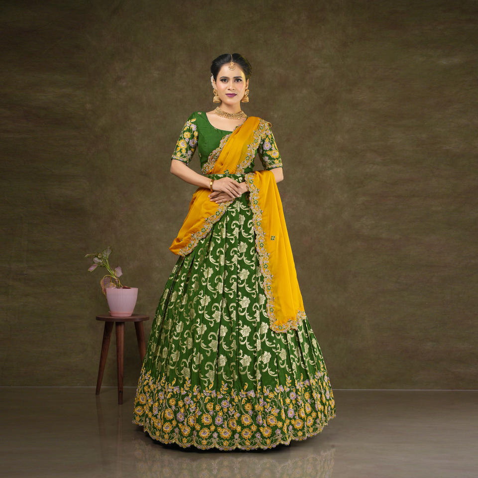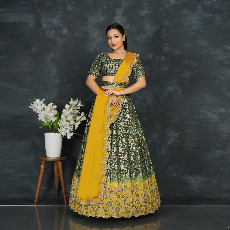 ชุดเลเฮนกาโชลีผ้าไหมบานาราซี พร้อมงานปักลายซารีหนักแน่น ประดับขอบด้วยงานปักอย่างสวยงาม เหมาะสำหรับงานแต่งงาน งานเลี้ยง และงานเฉลิมฉลอง ชุดกระโปรงดีไซเนอร์