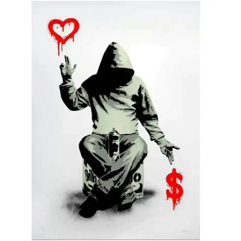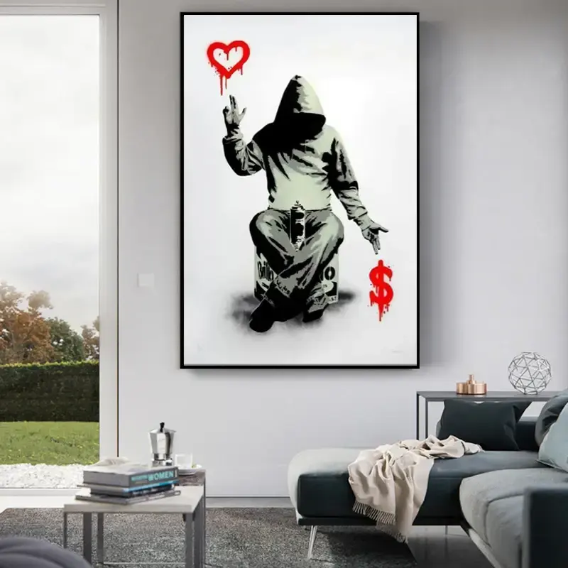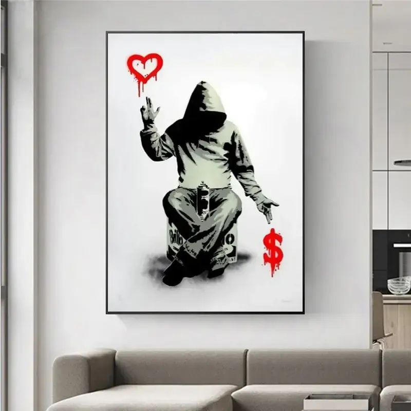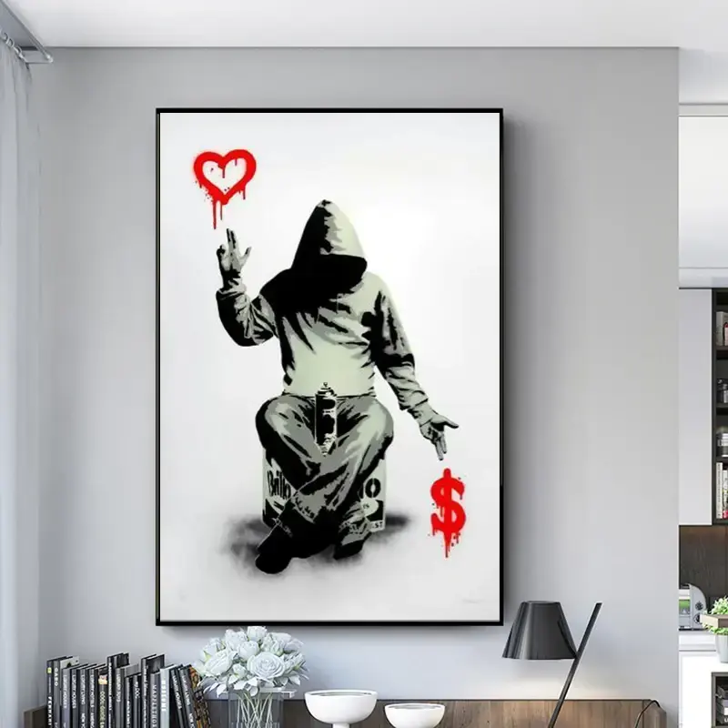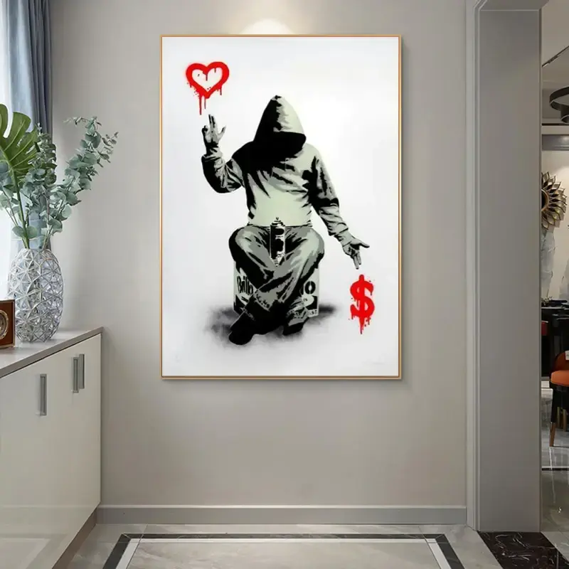 ภาพวาดกราฟฟิตีแบบนามธรรมของแบงก์ซี่บนผืนผ้าใบ ศิลปะสตรีทอาร์ตสมัยใหม่ โปสเตอร์ติดผนังในกรอบสีดำ
