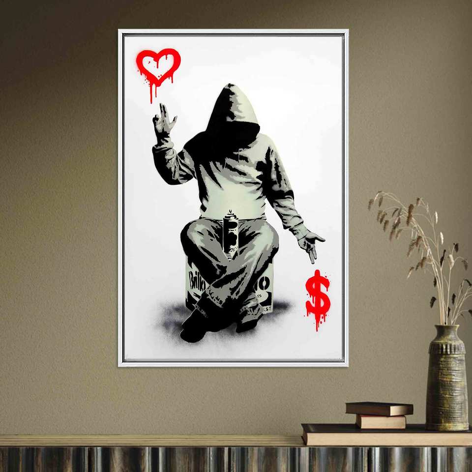 ภาพพิมพ์บนผ้าใบลายกราฟฟิตี "Banksy Love" หรือ "Dollar Graffiti" สำหรับตกแต่งผนังสไตล์สตรีทอาร์ต พร้อมกรอบสีขาว