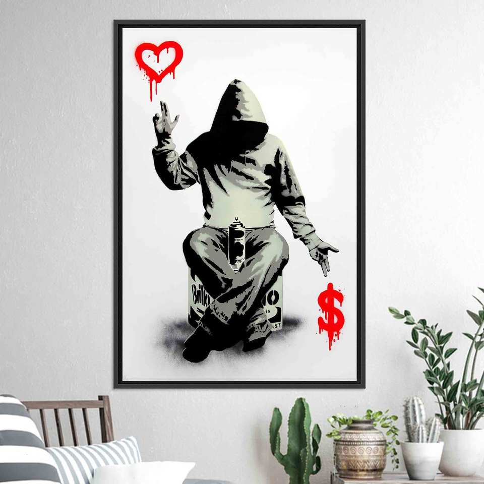 ภาพพิมพ์บนผ้าใบลายกราฟฟิตี "Banksy Love" หรือ "Dollar Graffiti": ของตกแต่งผนังแนวสตรีทอาร์ตสมัยใหม่, ผ้าใบกรอบสีดำ