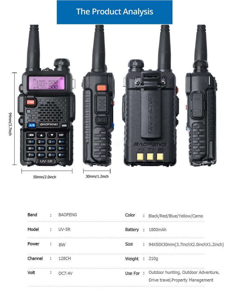 วิทยุสื่อสาร Bao Feng UV5R 128 ช่องสัญญาณ คู่ย่านความถี่ VHF/UHF กำลังส่ง 5 วัตต์ มาตรฐานกันน้ำ IPX-1 แบตเตอรี่ 1000-1500mAh วิทยุสื่อสารแบบอนาล็อก พร้อมไฟ LED