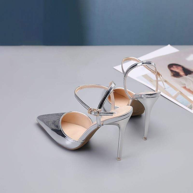 BAOTou รองเท้าแตะผู้หญิงหนังแท้หัวแหลมสุดเซ็กซี่, รองเท้าแต่งงานมีสายรัดข้อเท้าแบบบางขนาดหนึ่งขนาด