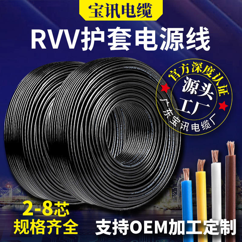 สายไฟ Baoxun ยาว 100 เมตร 2-8 แกน ทองแดงแท้ หุ้มฉนวน RVV ป้องกันไฟลุก สายไฟแบบยืดหยุ่นสำหรับใช้ในครัวเรือน