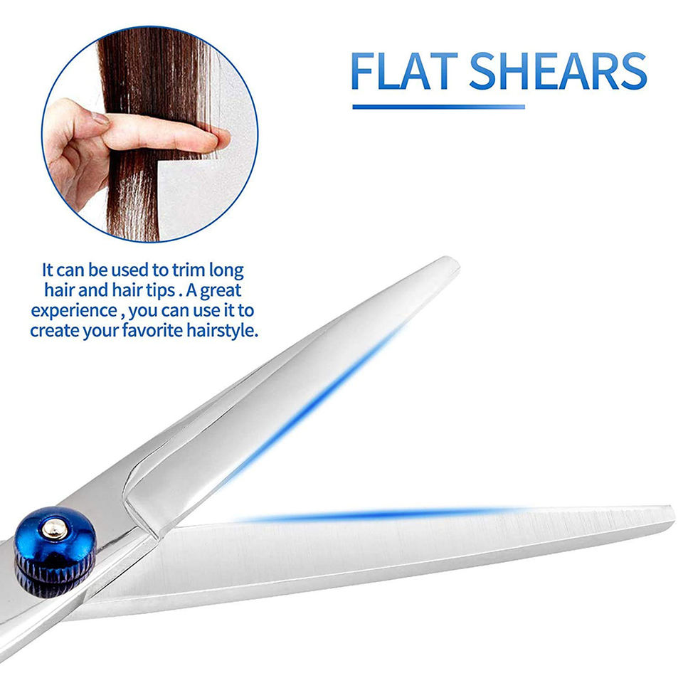 กรรไกรตกแต่งผมสำหรับช่างตัดผมทำจากเหล็กขัดเงาพร้อมสกรูปรับได้และแหวนยางสีฟ้า