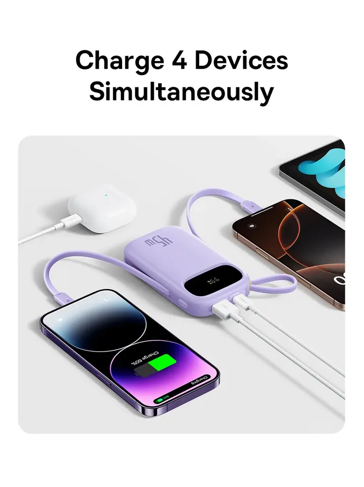 Baseus พาวเวอร์แบงค์45W 20000mAh 10000mAh ในตัว USB-C หดได้และสาย IP สำหรับ iPhone 17 16 15 Samsung S25 Xiaomi poco