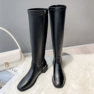 Basic Black Slim Fit Long Winter Boots for Women Low Heel Skirt Rider Skin Lined Boots