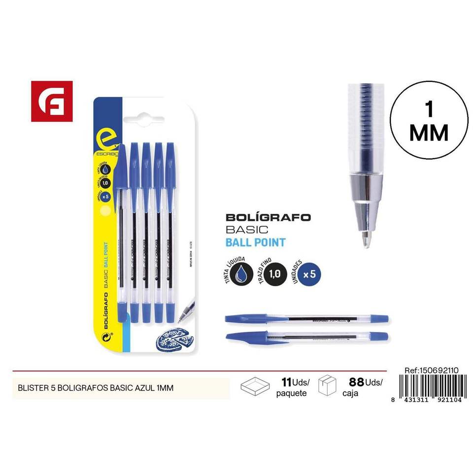 ปากกาลูกลื่น1มม. สีน้ำเงินพื้นฐานแพ็ค5ชิ้นเครื่องเขียนและอุปกรณ์การเขียน