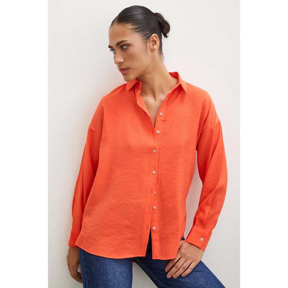 เสื้อเชิ้ตโมดอลพื้นฐาน สีส้ม เสื้อเชิ้ตป๊อปลินติดกระดุมลำลองสำหรับผู้หญิง สวมใส่ได้ทุกวัน