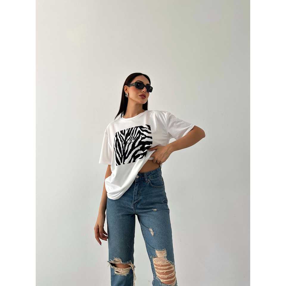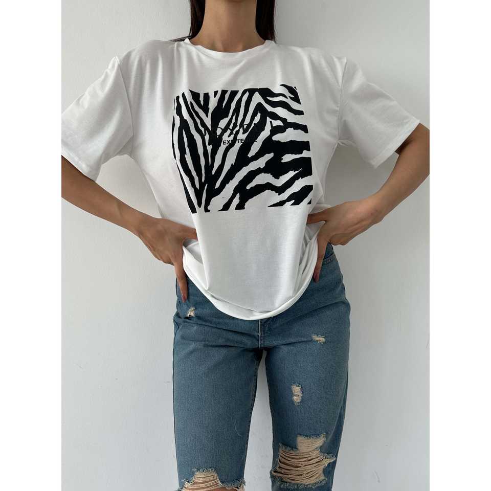 เสื้อยืดพิมพ์ลายพื้นฐานสำหรับผู้หญิง แขนสั้น ผ้าเจอร์ซีย์ ระบายอากาศได้ดี น้ำหนัก 220 กรัม สีขาว ลายม้าลาย