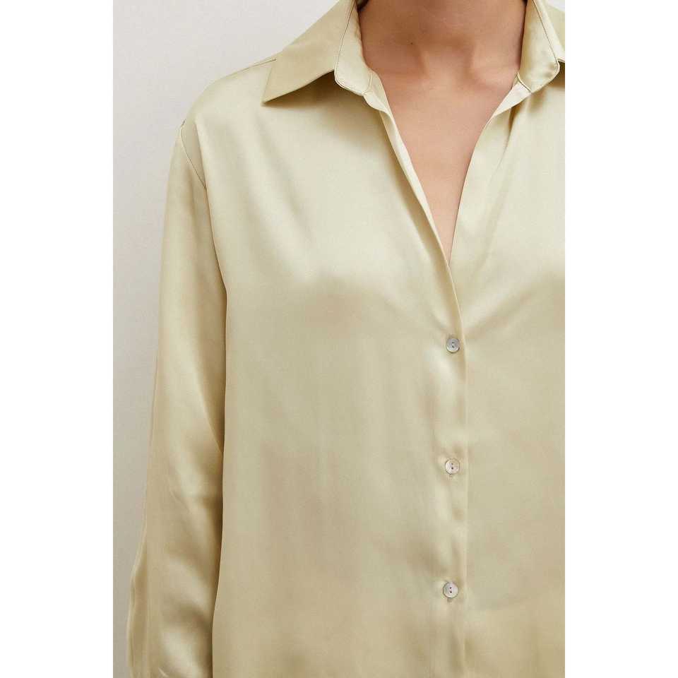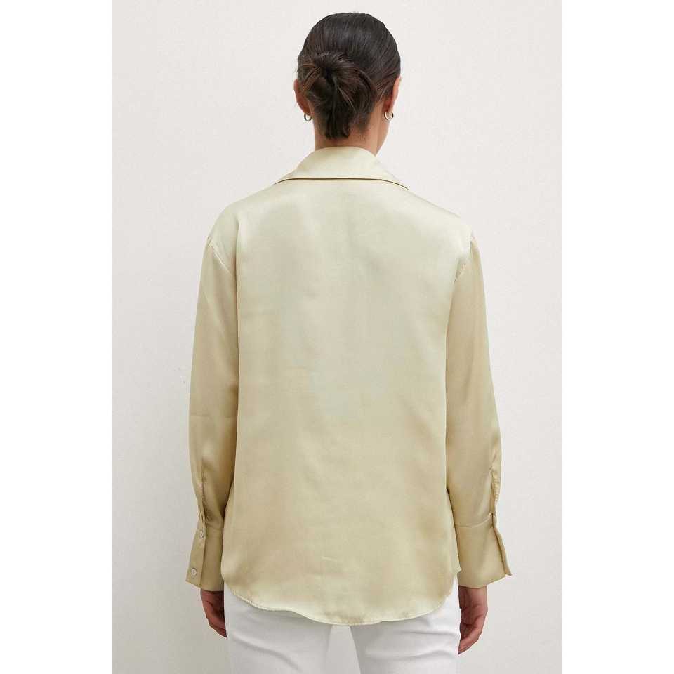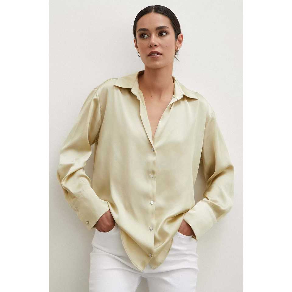 เสื้อเชิ้ตผ้าซาตินพื้นฐานสำหรับผู้หญิง สีเอครูเข้ม ติดกระดุม สไตล์มินิมอลสำหรับใส่ทุกวัน