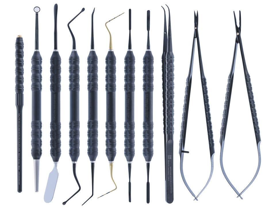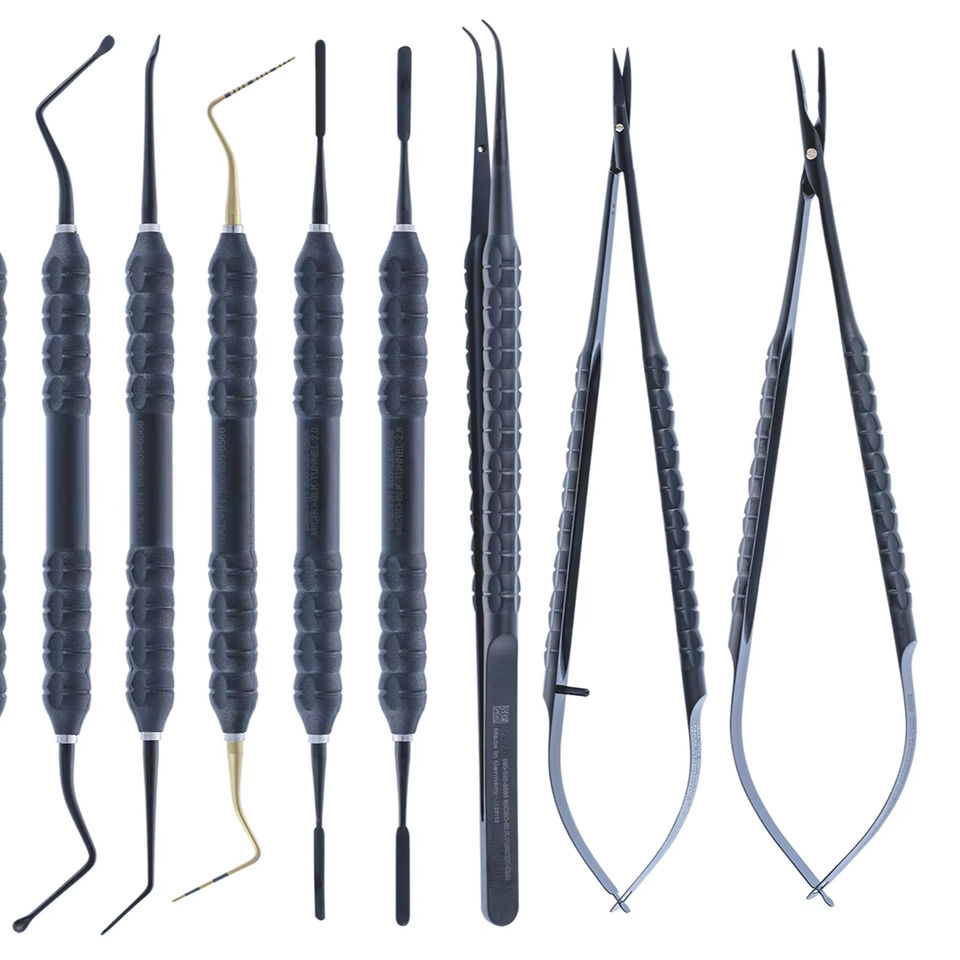 ชุดเครื่องมือผ่าตัดสแตนเลสสตีลแบบแมนนวล10ชิ้นเคลือบพรีเมี่ยมสีดำสำหรับใช้ในโรงพยาบาล