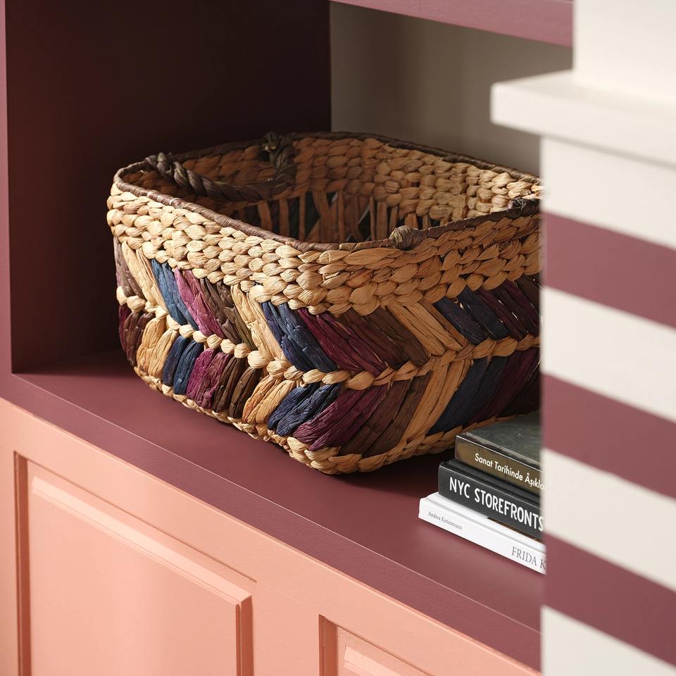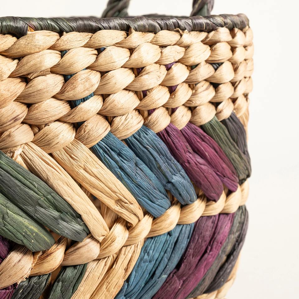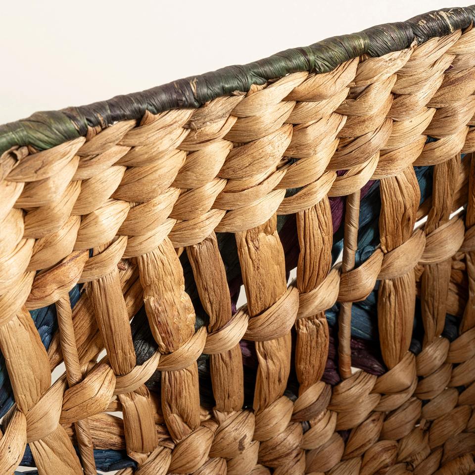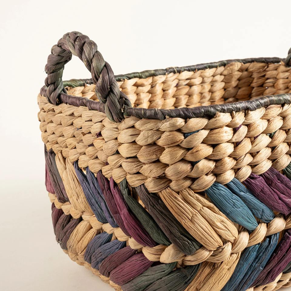 ตะกร้าผักตบชวาประดับด้วยสีสันหลากหลาย ตะกร้าเก็บของทำมือ ขายส่ง เป็นมิตรกับสิ่งแวดล้อม ผลิตในเวียดนาม