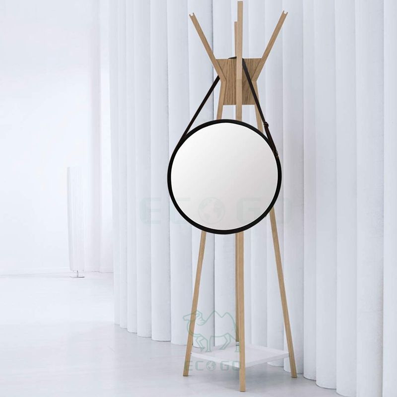 กรอบกระจกอาบน้ำติดผนังทรงกลมกรอบไม้ไผ่สีดำ & สายหนังสำหรับแขวนแบบปรับได้