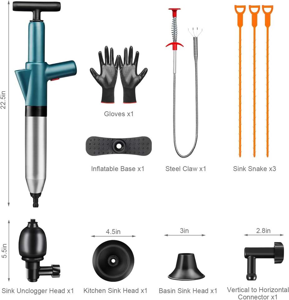 เครื่องมือแก้ไขท่อตันในห้องน้ำ อุปกรณ์ล้างท่อแรงดันสูง พร้อมเกจวัดแรงดันแบบมองเห็นได้ ที่ปั๊มลมสำหรับล้างท่อ ที่ดูดน้ำห้องน้ำ