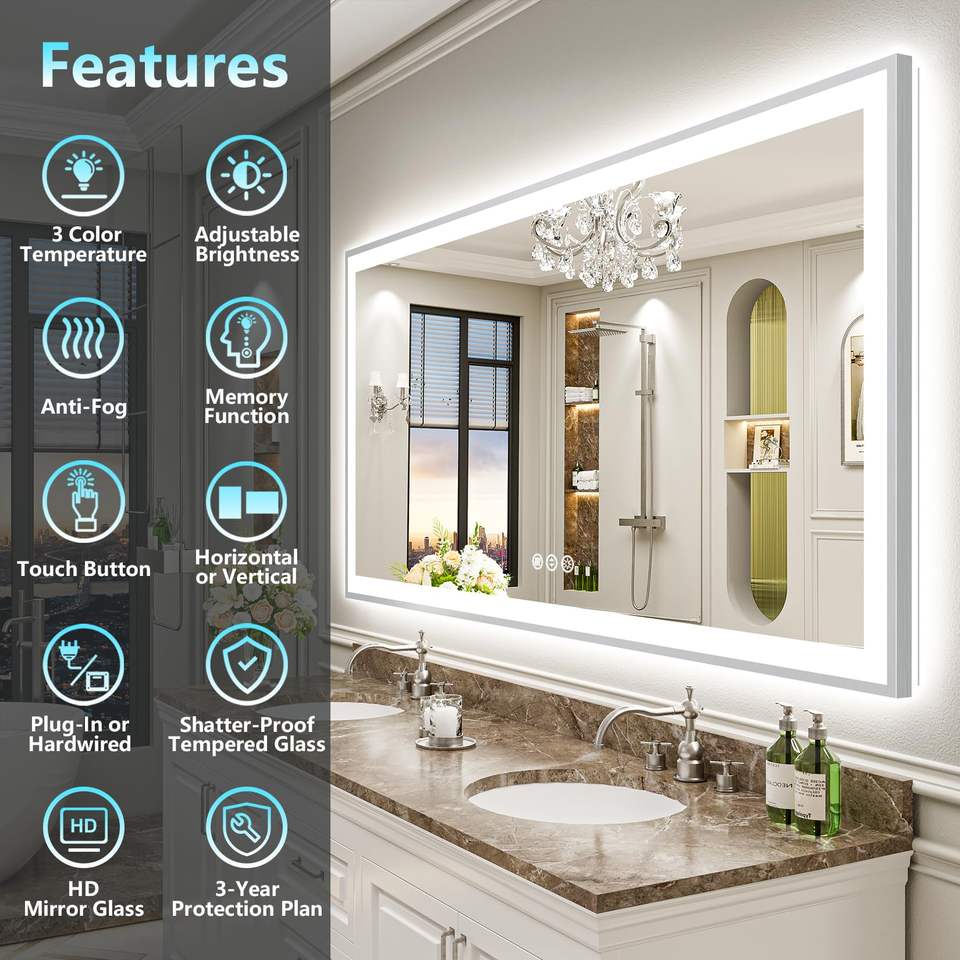 กระจกติดผนังกระจกสี่เหลี่ยมในห้องน้ำไฟ LED ส่องสว่างสำหรับห้องน้ำกระจกติดผนัง