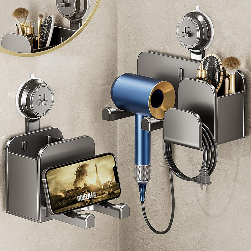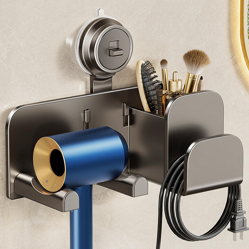 ที่วางไดร์เป่าผมแบบติดผนังสีเทา แบบไม่ต้องเจาะ พร้อมที่เก็บของ รูปทรงสี่เหลี่ยมผืนผ้า ผิวขัดเงา