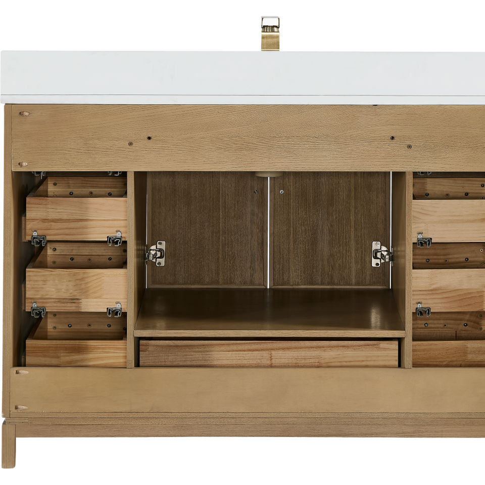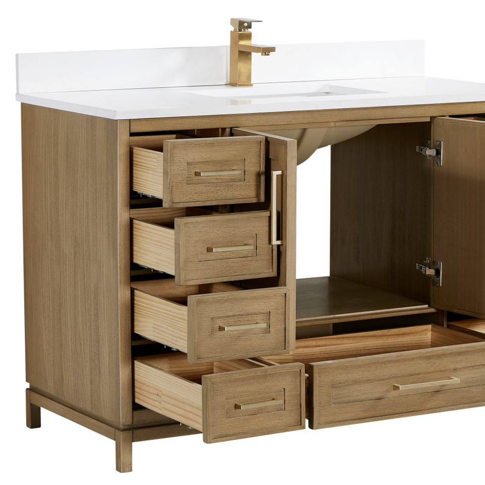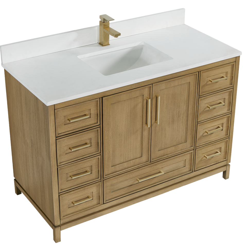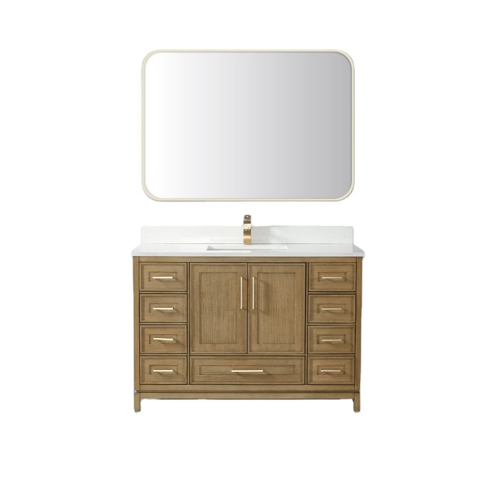 ตู้ห้องน้ำผลิตในเวียดนาม ดีไซน์ทันสมัย กระจกติดกรอบ ตู้วางพื้นไม้โอ๊คสีเดสเซิร์ต