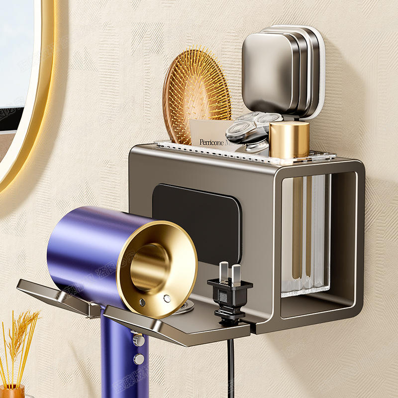 ที่แขวนไดร์เป่าผมติดผนังห้องน้ำ สีเทากันเมทัล รูปทรงสี่เหลี่ยมผืนผ้า แบบไม่ต้องเจาะ ติดตั้งด้วยถ้วยดูดสุญญากาศ สำหรับห้องน้ำและห้องสุขา