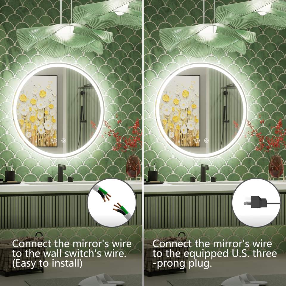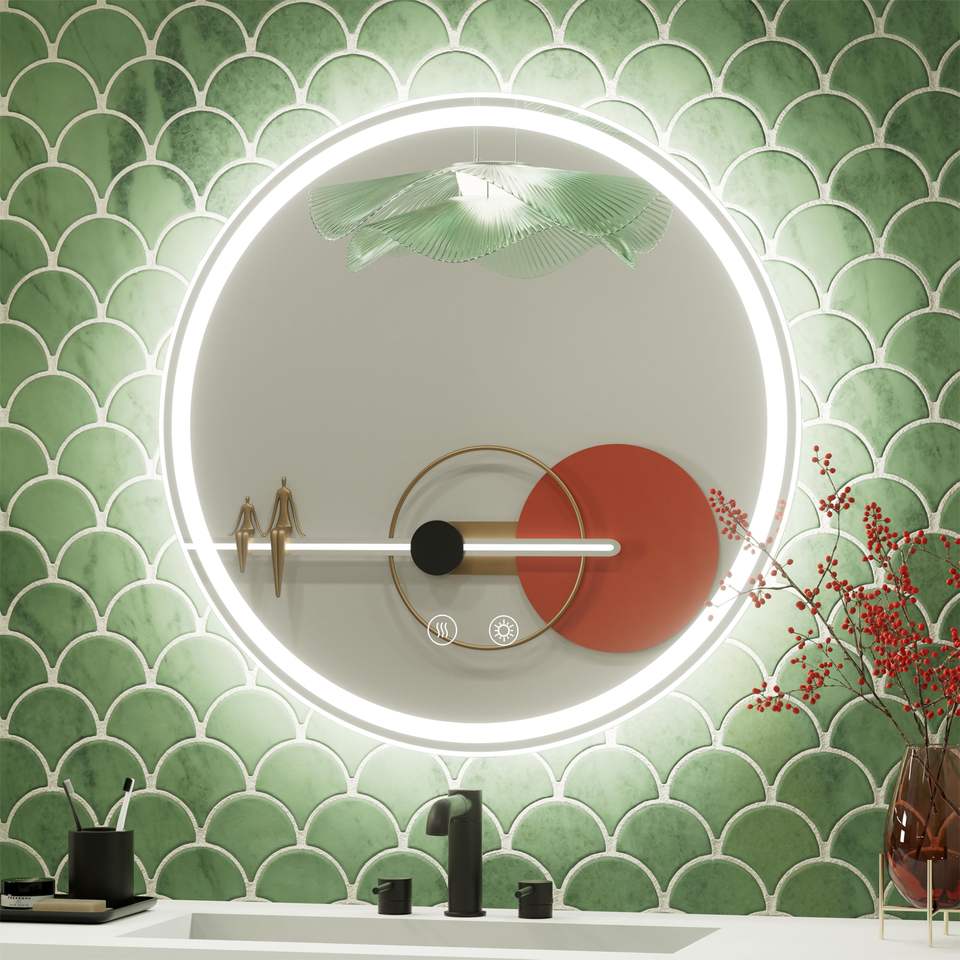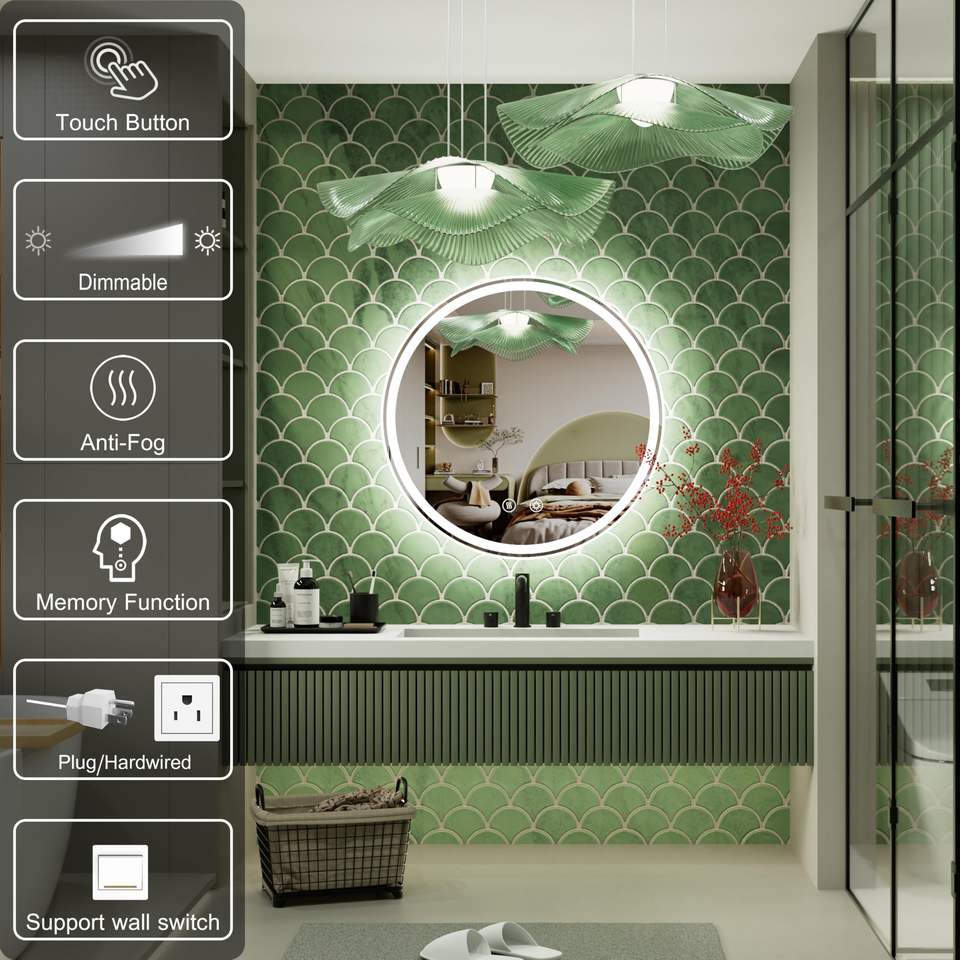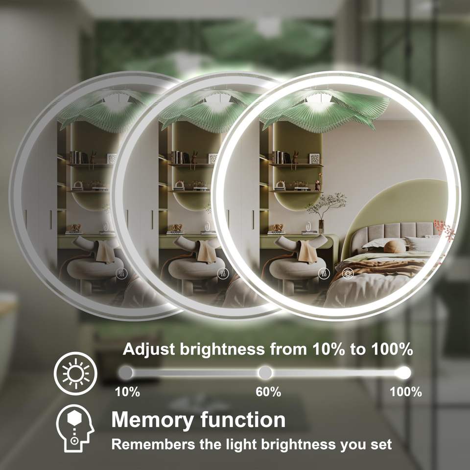 กระจกไฟ LED ติดผนังในห้องน้ำทรงกลมมีไฟกระจกห้องน้ำกันหมอกอัจฉริยะ