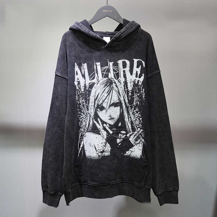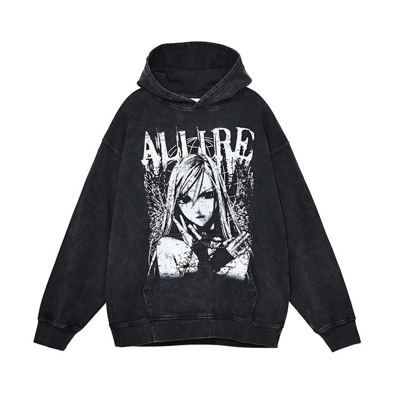 เสื้อมีฮู้ดผ้าบาติกเทอร์รี่380จีเอสเอ็มเสื้อผ้าการ์ตูนผ้าฝ้ายโอเวอร์ไซส์ใหญ่พิเศษซักได้แบบย้อนยุคมีฮู้ดสีดำ
