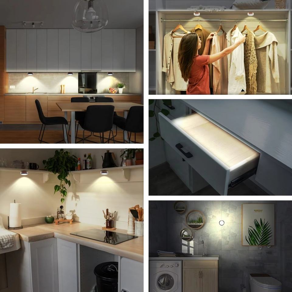 ไฟเตือนความเคลื่อนไหวไร้สายสีดำแบบใช้แบตเตอรี่ ไฟ LED ใต้ตู้ ไฟ LED เซ็นเซอร์กลางคืนสำหรับตู้เสื้อผ้า บันได ห้องครัว