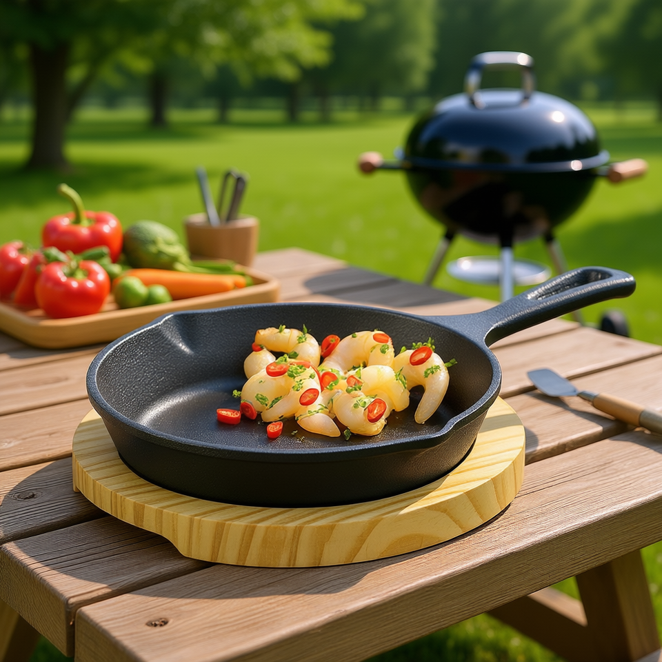 กระทะเสิร์ฟบาร์บีคิวพร้อมด้ามจับ แผ่นไม้สำหรับทำอาหารกลางแจ้ง