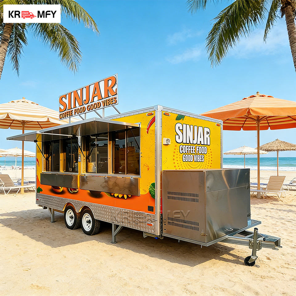 รถเข็นเคลื่อนที่สำหรับปิ้งย่างบาร์บีคิว อุปกรณ์ครัวกลางแจ้ง ทำจากไฟเบอร์กลาสและอะลูมิเนียม เหมาะสำหรับขายอาหารริมชายหาด รถพ่วงขายอาหารเคลื่อนที่สำหรับการท่องเที่ยว