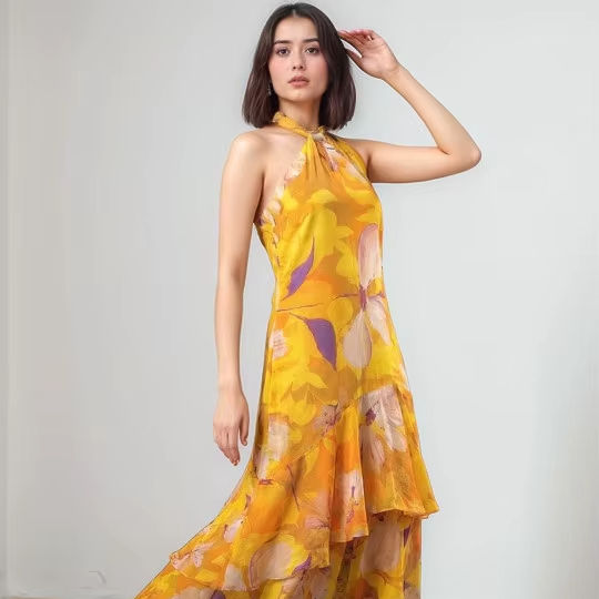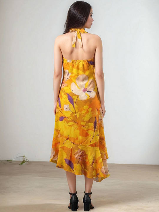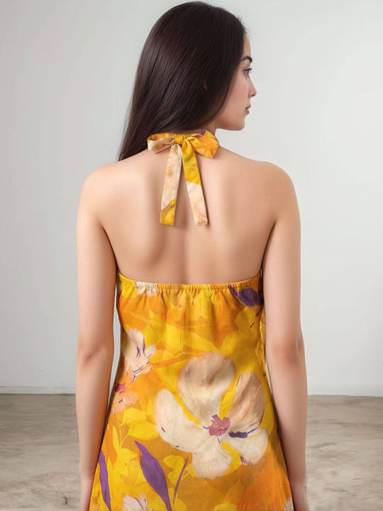 ชุดเดรสยาวปานกลางลายดอกไม้ คอ halter ผ้าฝ้ายธรรมชาติ แขนกุด สำหรับผู้หญิง เหมาะเป็นของขวัญสำหรับเธอ