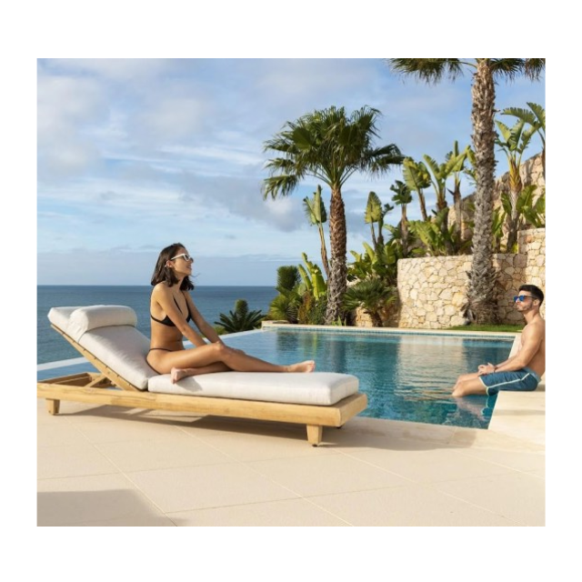 เตียงอาบแดดทำจากไม้สักชายหาดและสระว่ายน้ำเตียงอาบแดดธรรมชาติ