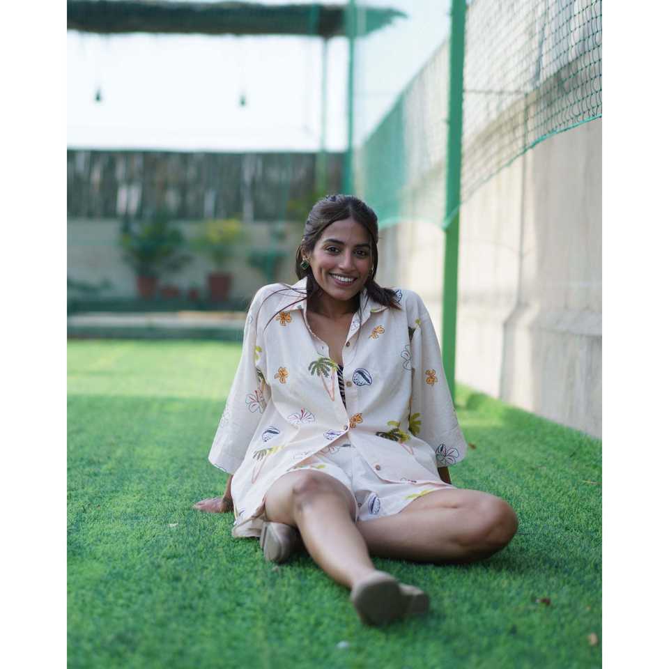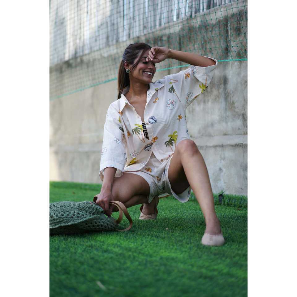 เสื้อเชิ้ตผู้หญิงผ้าฝ้าย 100% ระบายอากาศได้ดี ลายต้นปาล์ม เปลือกหอย และดอกไม้ พร้อมดีไซน์กระดุมเรียบง่าย
