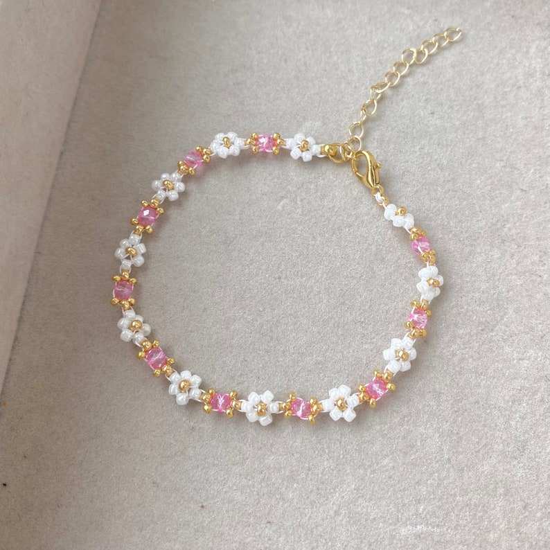 สร้อยข้อมือลูกปัดดอกไม้เดซี่สร้อยข้อมือดอกไม้สีชมพูเครื่องประดับทำมือสวยงามของขวัญน่ารักสำหรับวันเกิดของเธอ